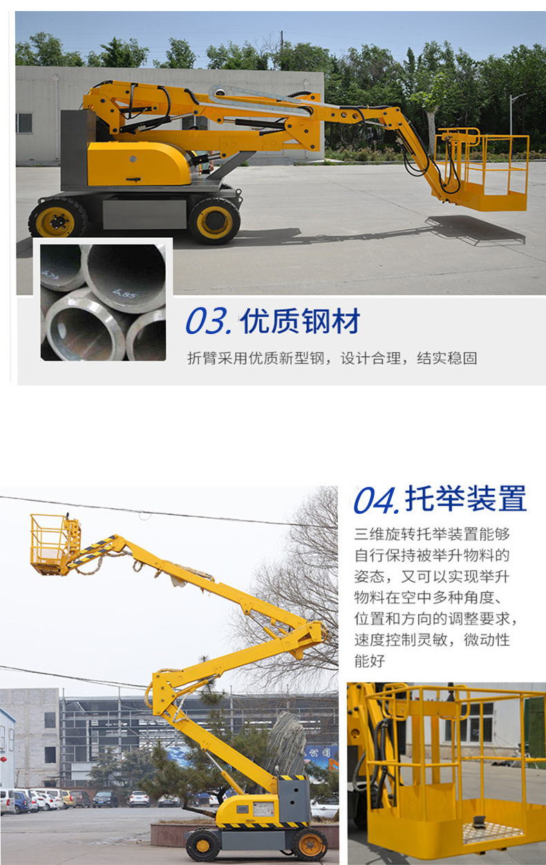 自行曲臂式高空作業(yè)平臺(tái)動(dòng)力分為柴油機(jī)發(fā)動(dòng)機(jī)型、直流馬達(dá)型,升降臂有二節(jié)、三節(jié)、升降高度從10米至32米、所有機(jī)型全高度行走、曲臂延伸升降、轉(zhuǎn)盤360°旋轉(zhuǎn)。自行曲臂式高空作業(yè)平臺(tái),操作簡(jiǎn)單,使用方便,作業(yè)面大。供室外高空作業(yè)使用;在平臺(tái)上方就可控制設(shè)備升降行走,能夠跨越一定障礙或在一處升降可進(jìn)行多點(diǎn)高空作業(yè)。